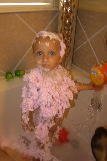 Today Garrett surprised me by saying lots of new things. (These will probably be one-time ordeals, not to be added to his current list of words - dog, mom, dad, car - but he also said "Elmbo" for Elmo a few times, duck, cow, Duke, ball, & "baba" a few times when he saw a baby in a book. He started cock-a-doodle-dooing when he sees a rooster in his book - I have witnesses! I love he sounds at this age - like a little drunk foreigner.We had fun with the bath tonight! Thanks for the Elmo soap, Aunt C!